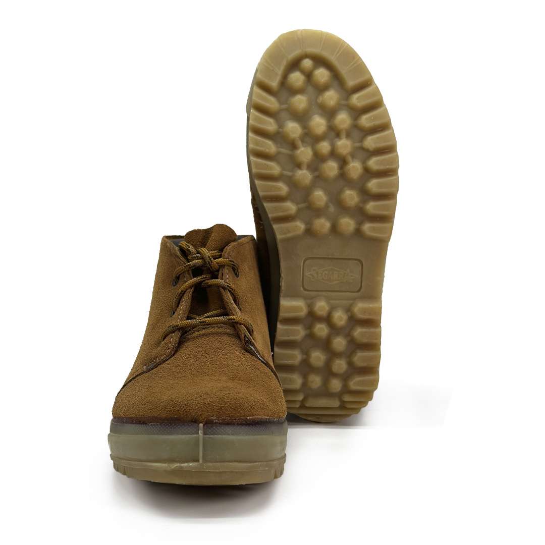 Parte superior: Serraje natural Forro: Cambrelle con ribete de color tostado Plantilla: Extraíble de EVA termoconformada Suela: Caucho color caramelo mod. TEJA Fabricación: Caucho natural vulcanizado directamente al corte Ojetes: Hierro pavonado Otras características: Ideal para zonas templadas y frías Uso: Puestos de trabajo sin riesgo de caída de materiales sobre el pie y actividades al aire libre