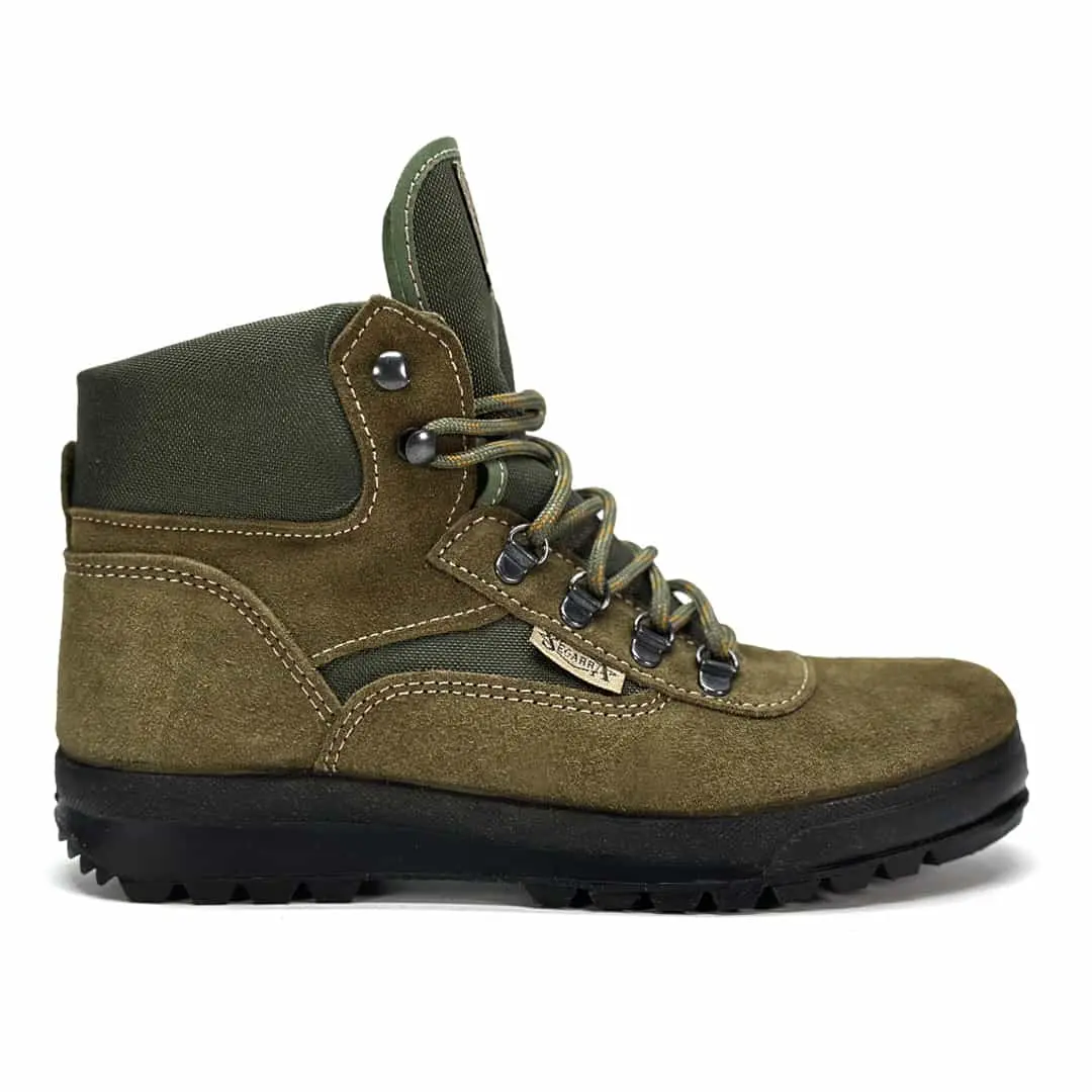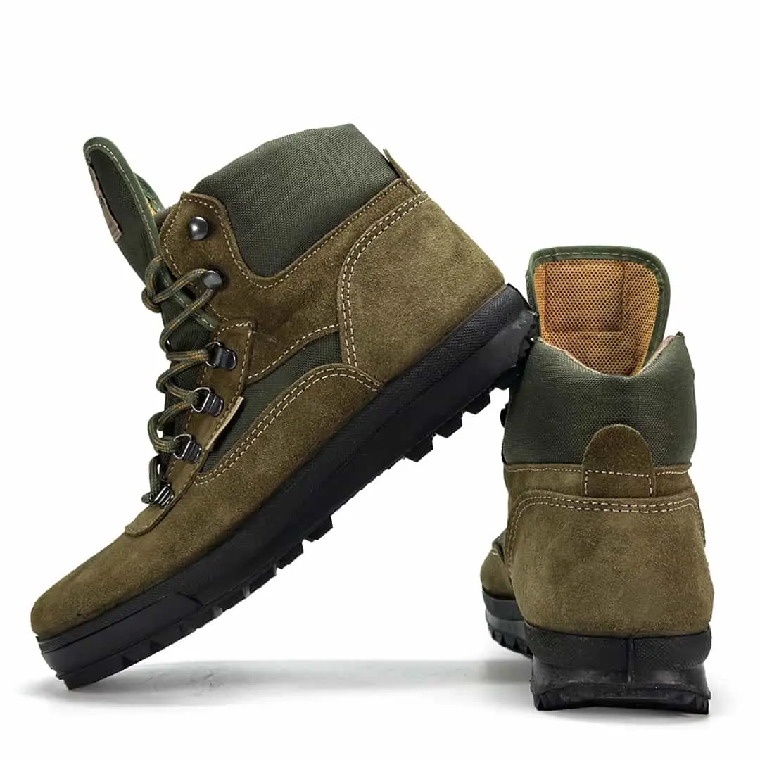 Parte superior: Serraje kaky de 1.6 mm con cordura. Forro: Orlando con collarín acolchado. Plantilla: Extraíble de EVA termoconformada. Suela: Caucho color negro antideslizante TEJA. Contiene lámina interior de corcho para aislamiento de frío y calor. Fabricación: Caucho natural vulcanizado directamente al corte. Ganchos: Metálicos. Otras características: Ideal para zonas templadas. Uso: Senderismo de media montaña y trabajos de campo.